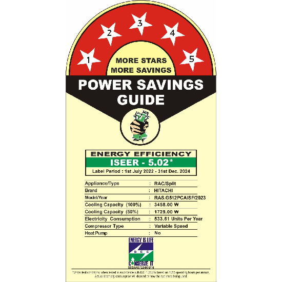 - Energy Rating : 5 Star - Best in class efficiency | Annual Energy Consumption: 533.61 Units Per Year| ISEER Value: 5.02 The star rating is as per BEE guidelines